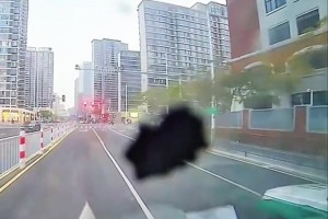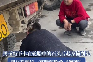 男子敲下卡在轮胎中的石头后起身撞到头,朋友看到这瞬间脸色僵硬